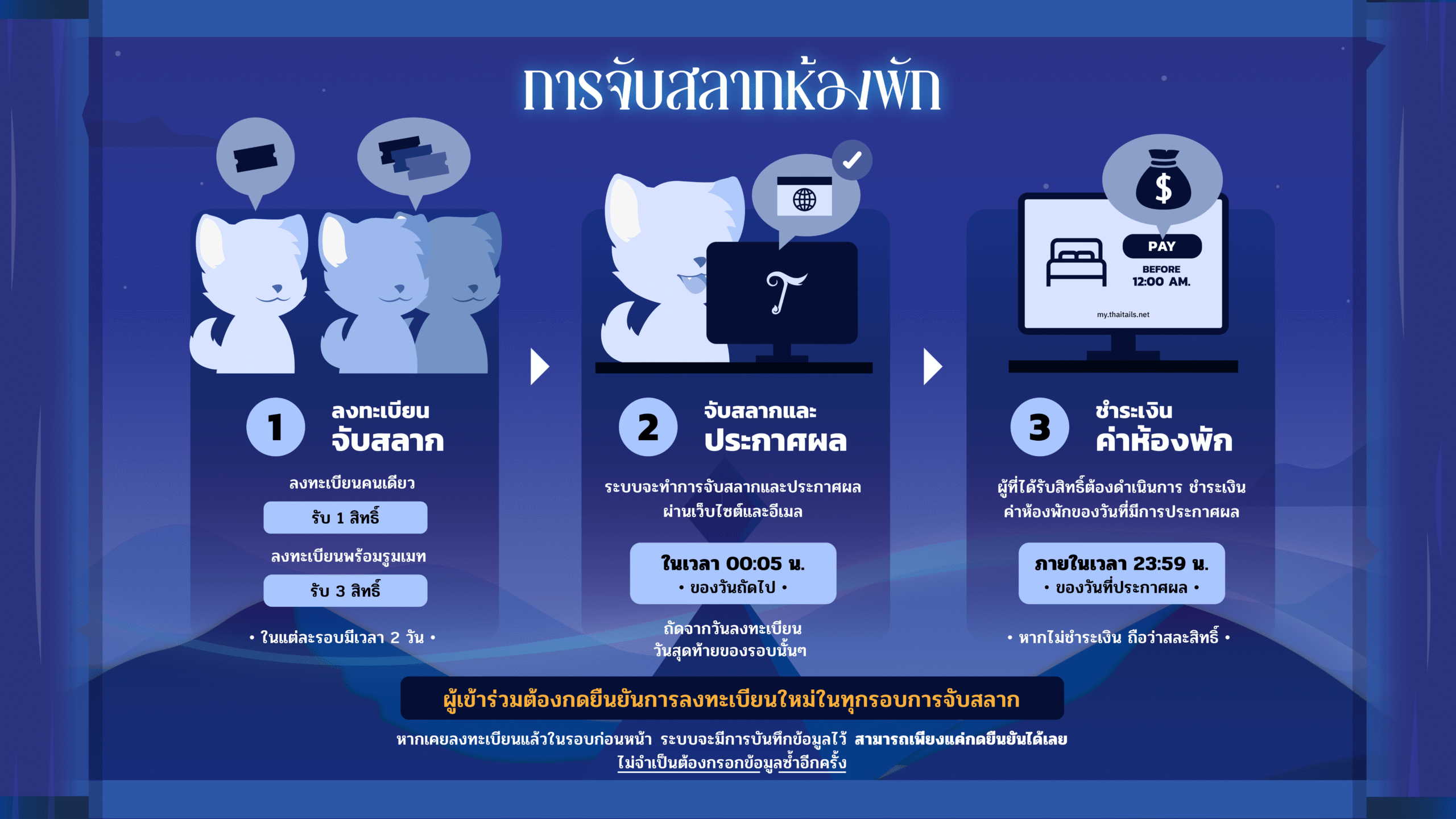 ผู้เข้าร่วมงานที่ได้รับสิทธิ์จองห้อง จำเป็นต้องชำระเงิน ภายในเที่ยงคืนของวันที่ได้รับสิทธิ์ผ่านทางเว็บไซต์ลงทะเบียน